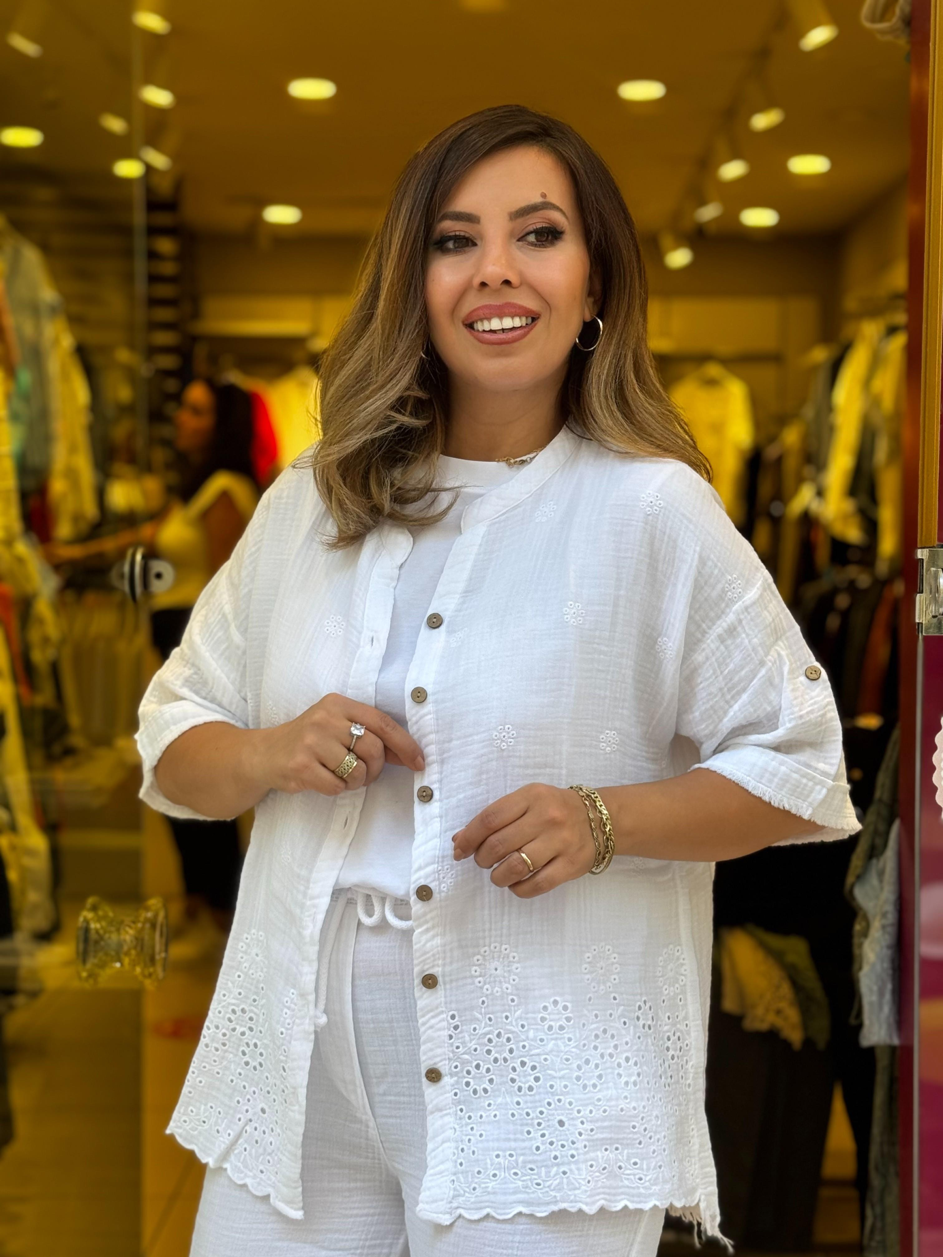 %100 Müslin Kol Düğme Detaylı Fistolu Gömlek Beyaz
