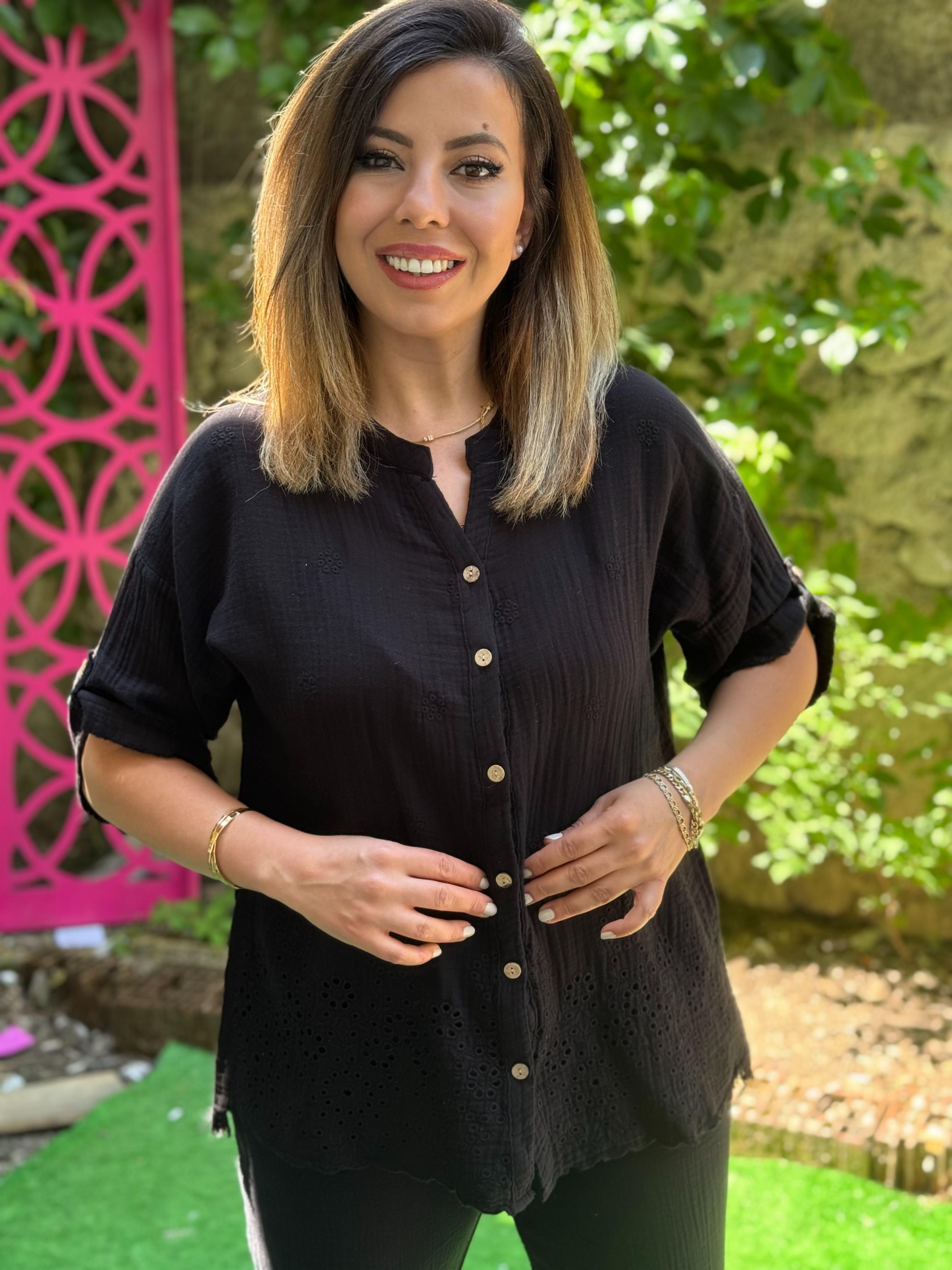 %100 Müslin Kol Düğme Detaylı Fistolu Gömlek Siyah