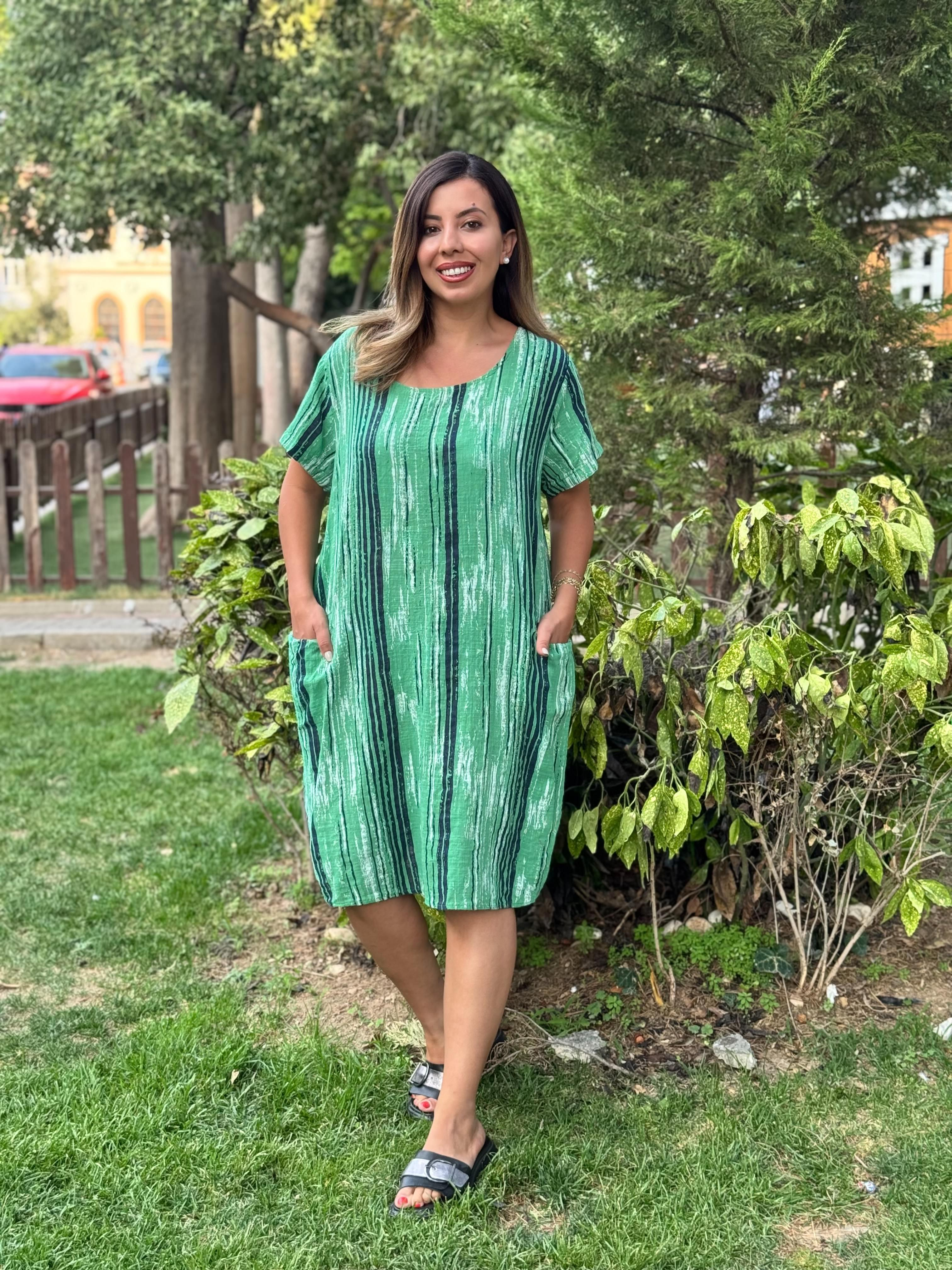 %100 Pamuk Keten Çizgi Desenli Kısa Kollu İthal Elbise Yeşil (122)