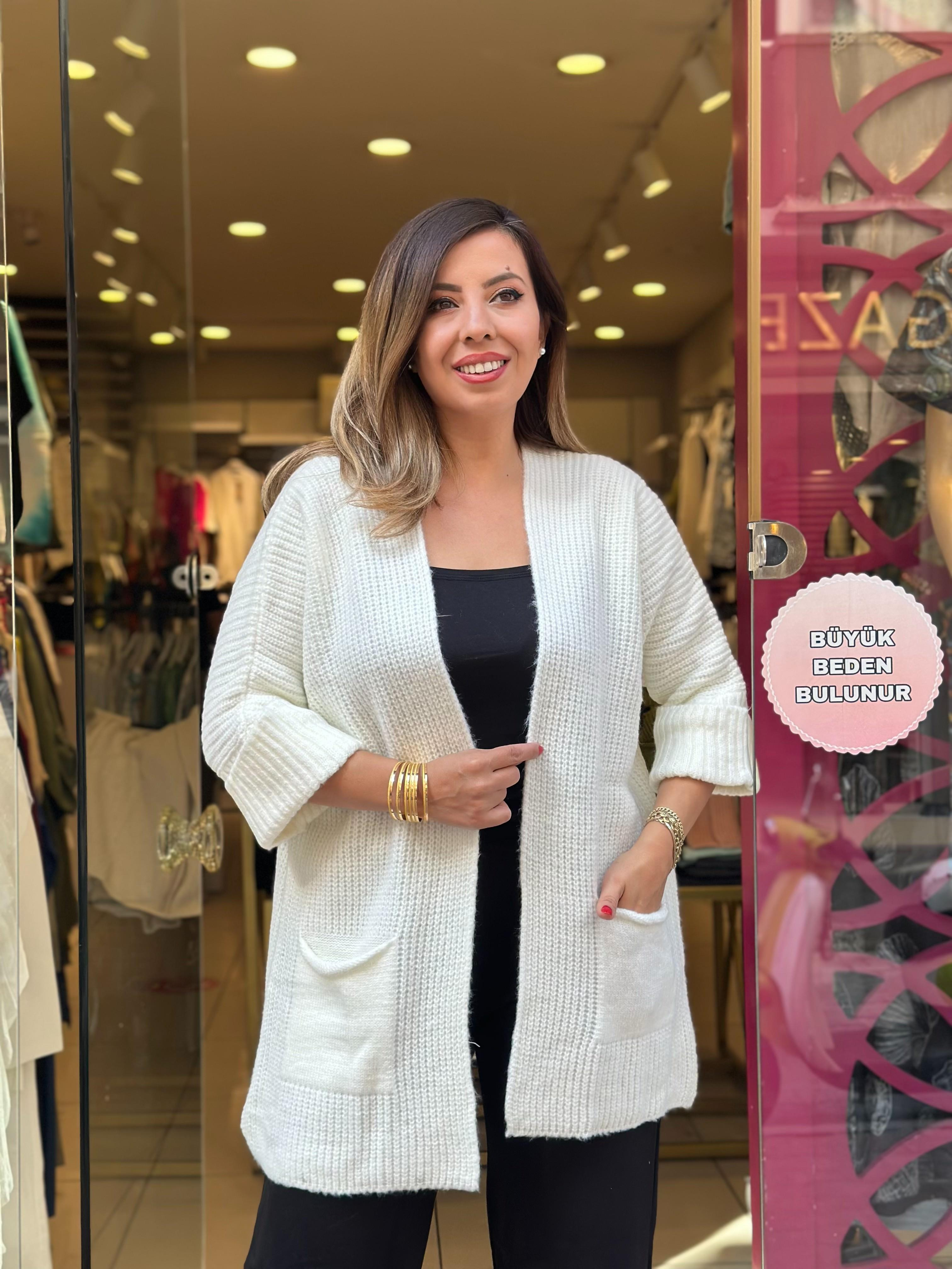 Kol Katlamalı Önü Açık Yün Hırka Krem (113)