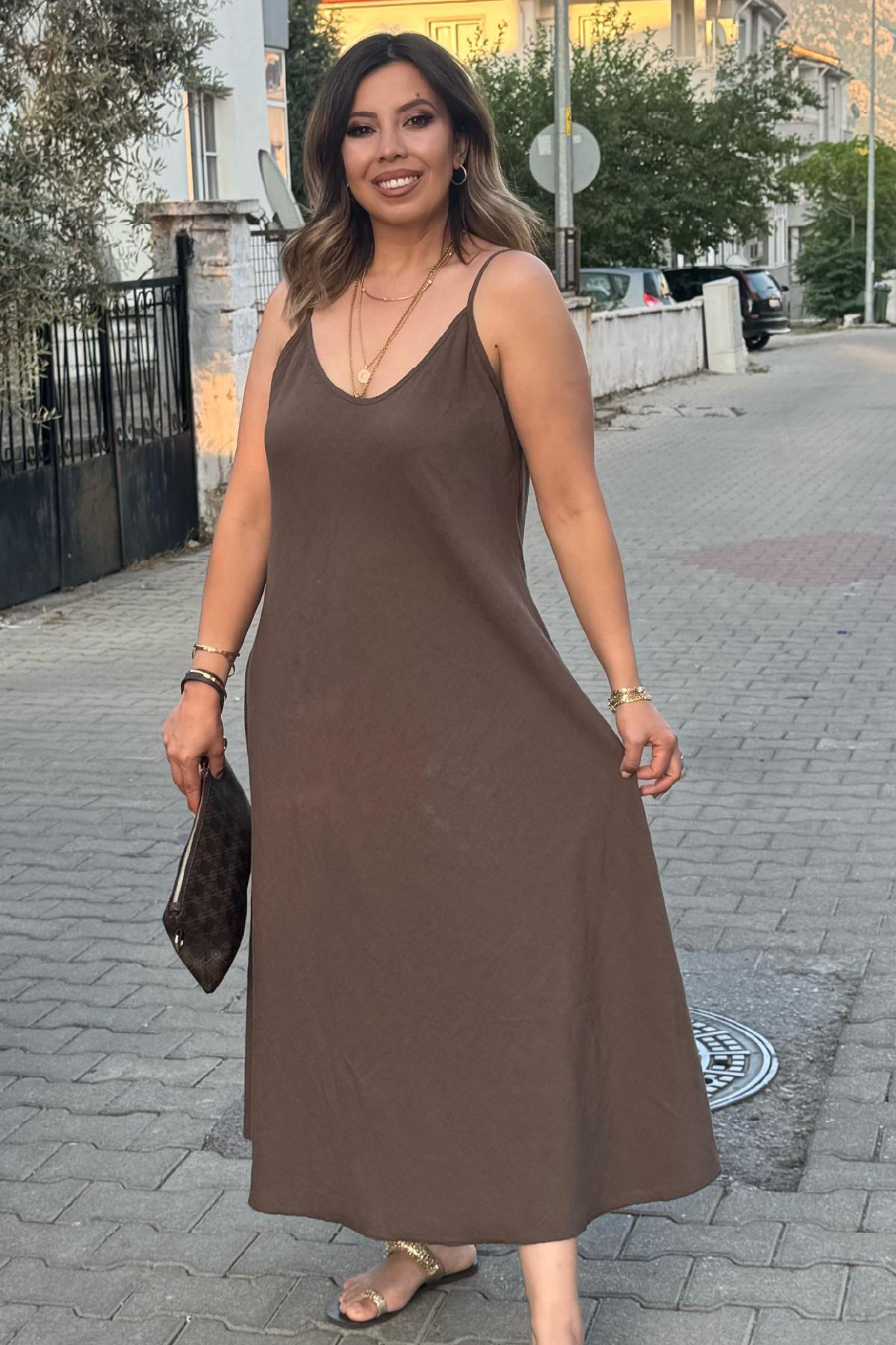 Pamuk Keten Ayarlanabilir İp Askılı Elbise