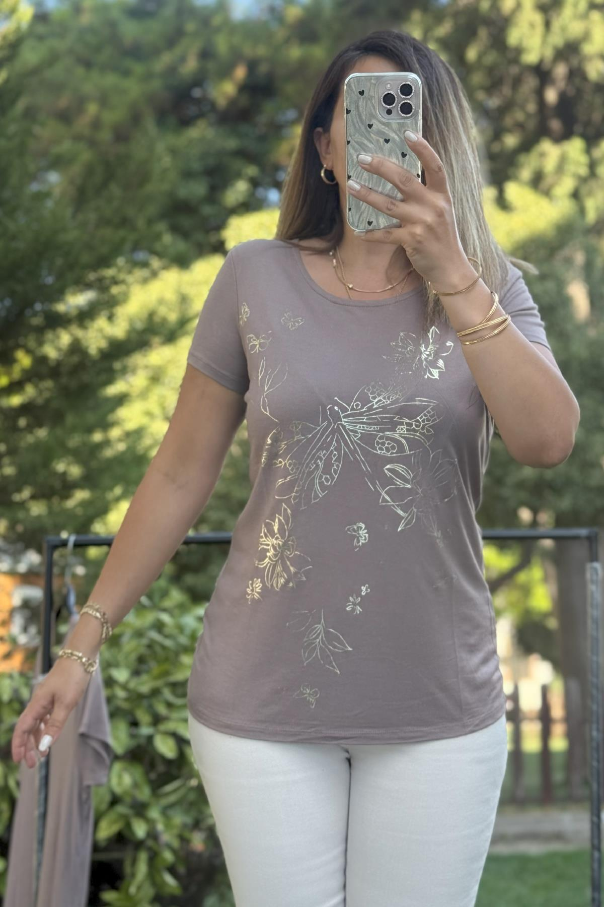 Parlak Çiçek Baskılı T-shirt Vizon (293)